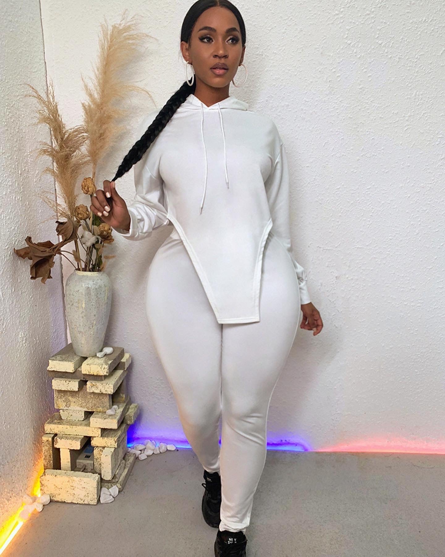 All white 2 piece matching set cropped asymmetrical hooded top with pants.